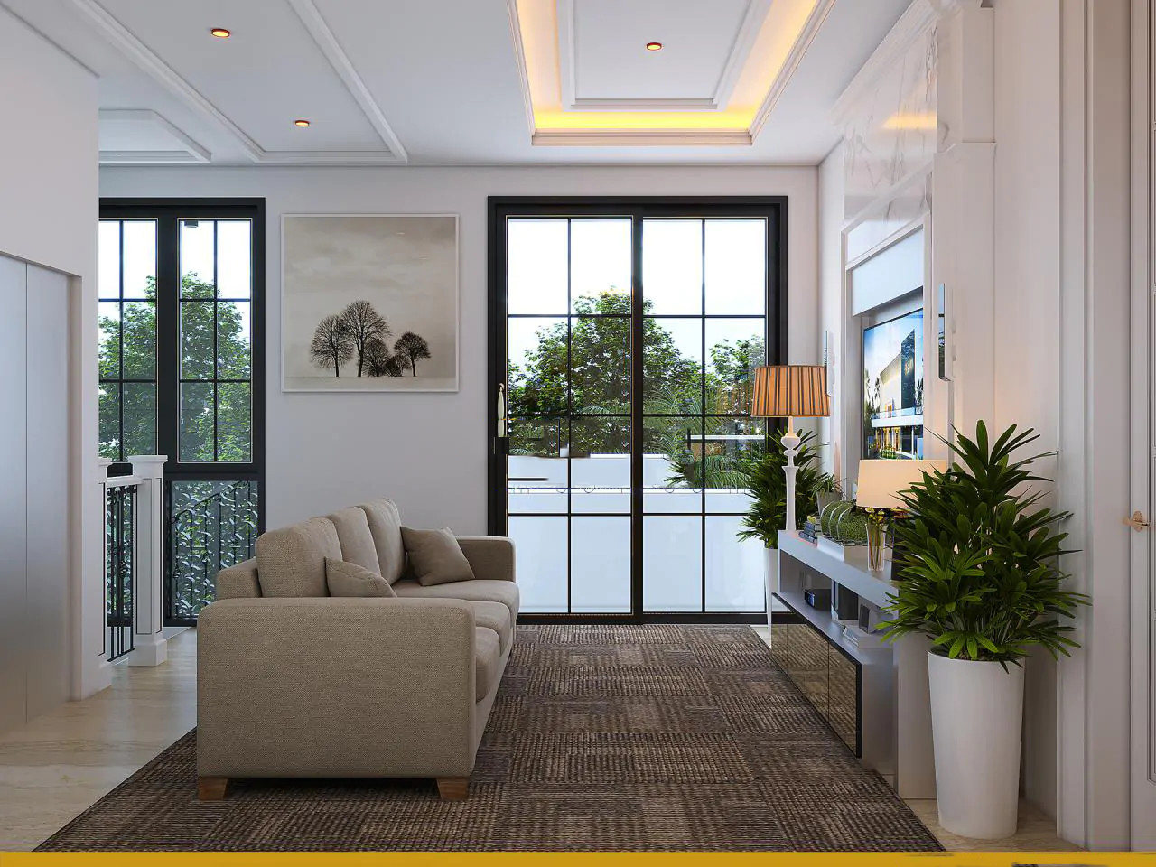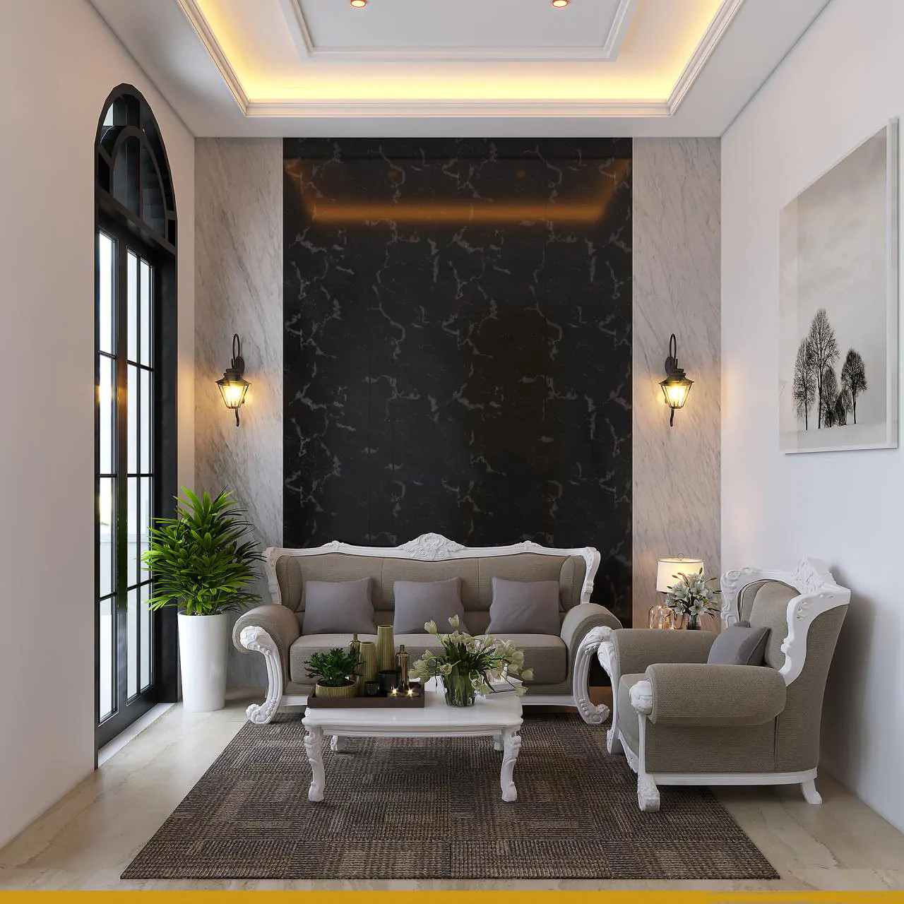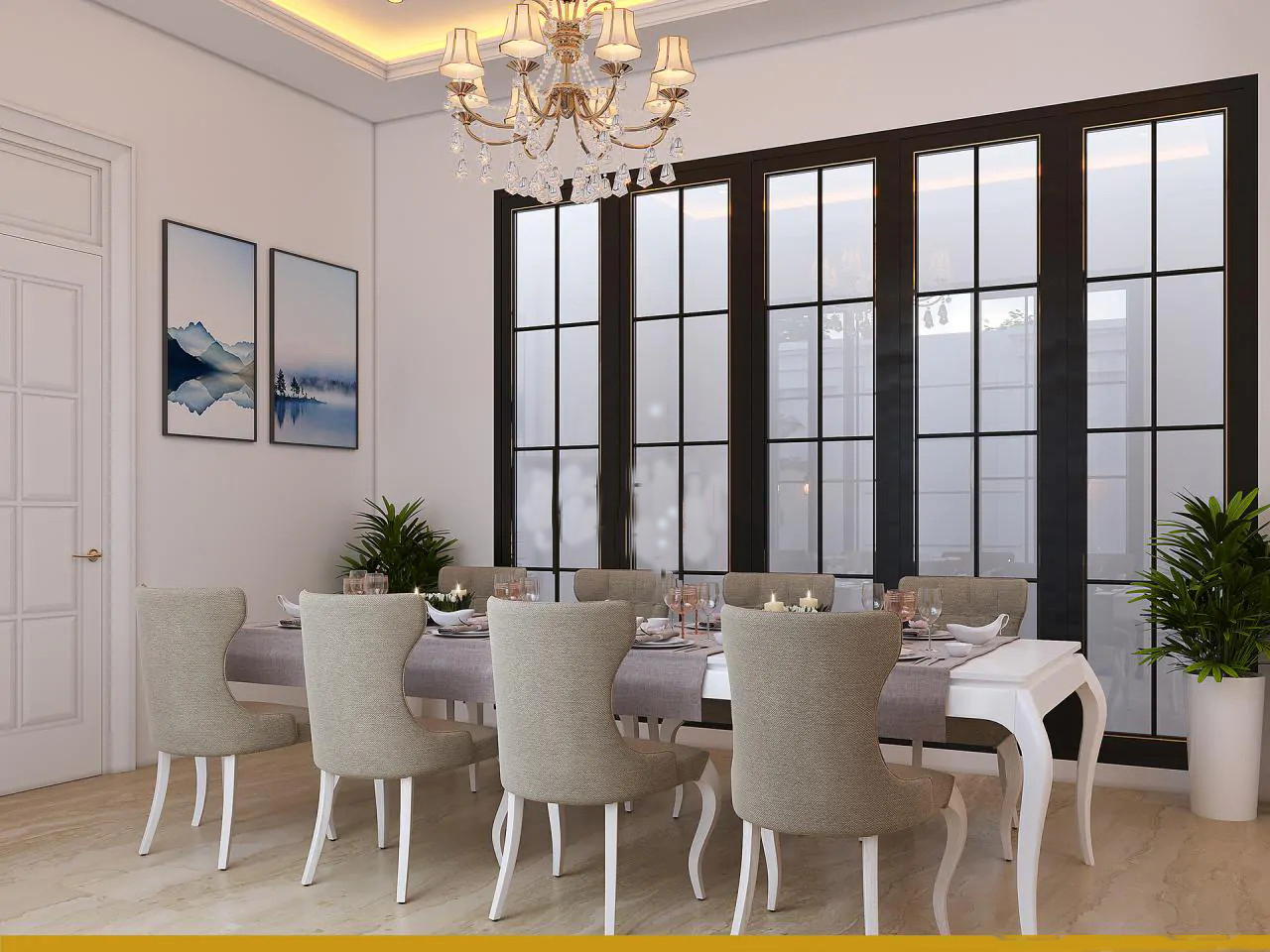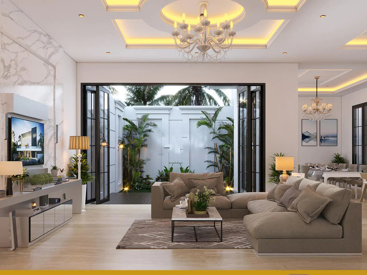 Không chỉ sở hữu thiết kế ngoại thất sang trọng, bề thế, ngôi biệt thự còn được chau truốt cả phần nội thất bên trong. Lấy tinh thần nguyên bản của phong cách tân cổ điển làm gốc, nội thất của ngôi nhà được bố trí theo hướng tối giản nhưng vẫn đảm bảo được yêu cầu thẩm mỹ khắt khe cùng sự sang trọng vốn có. Yếu tố xanh cũng được tích hợp thêm vào thiết kế nhằm tạo nên một không gian nghỉ ngơi trong lành, mát mẻ và gần gũi với thiên nhiên cho mọi thành viên trong gia đình chủ đầu tư.