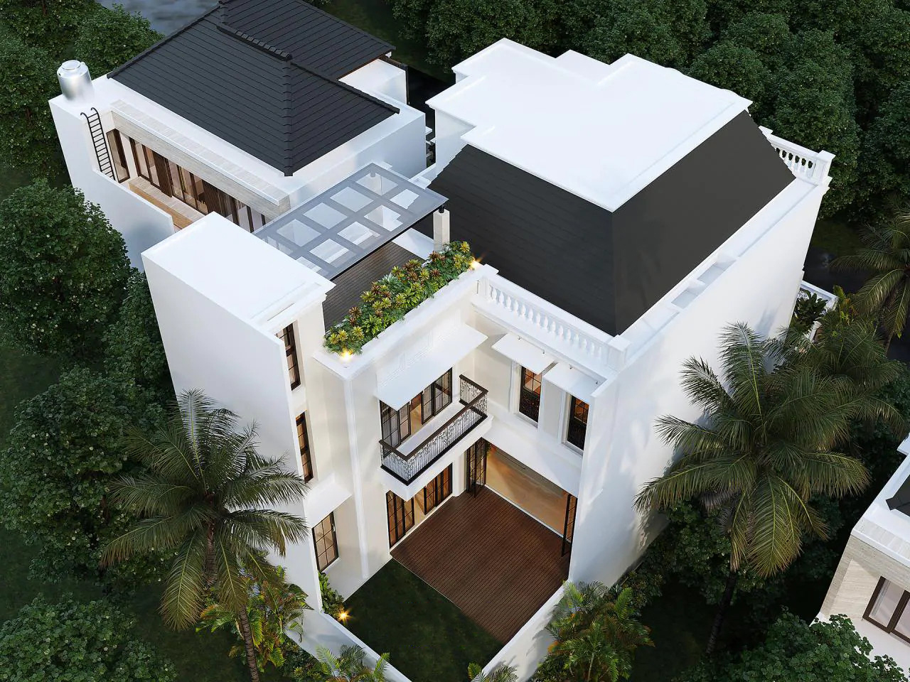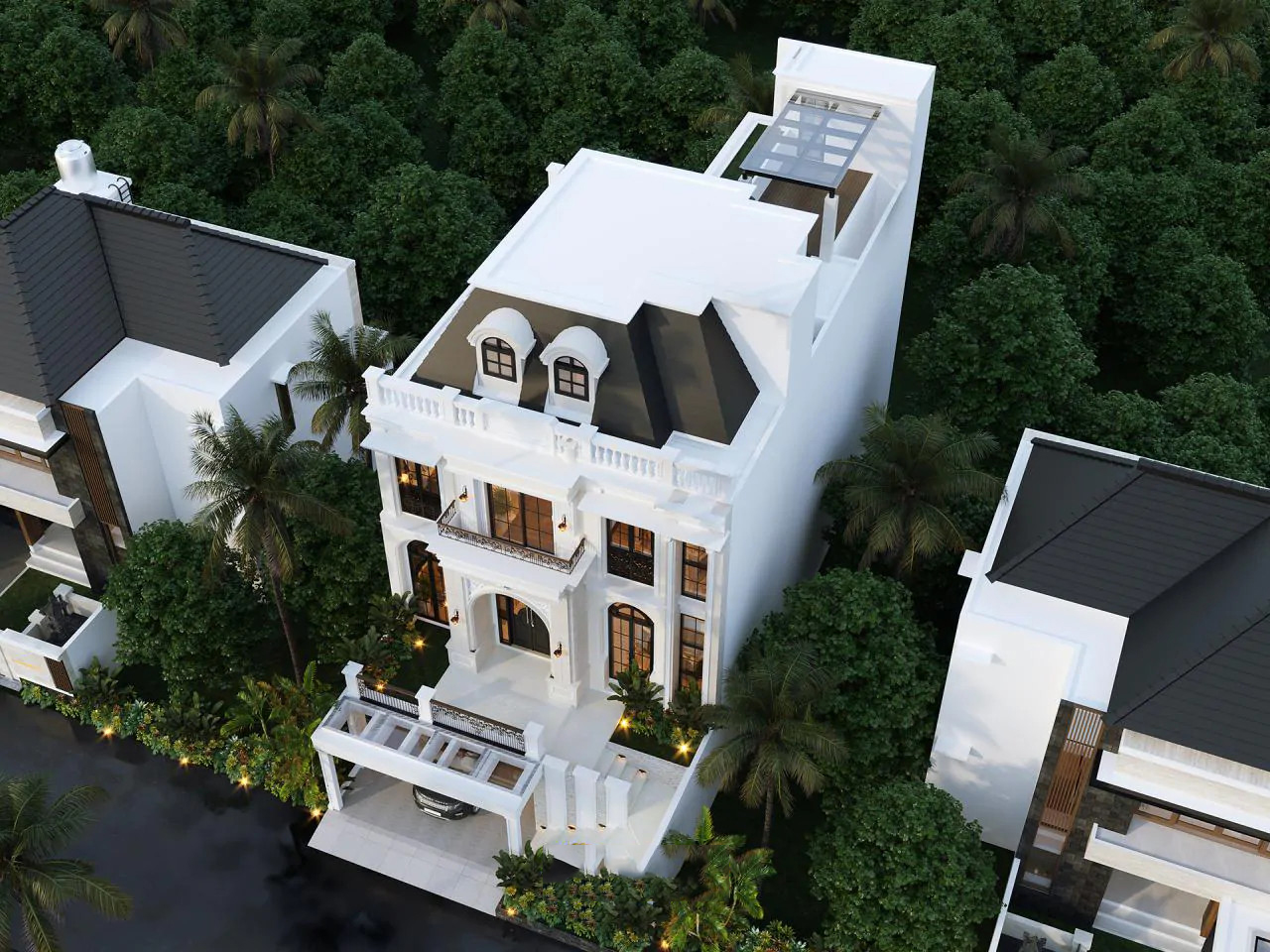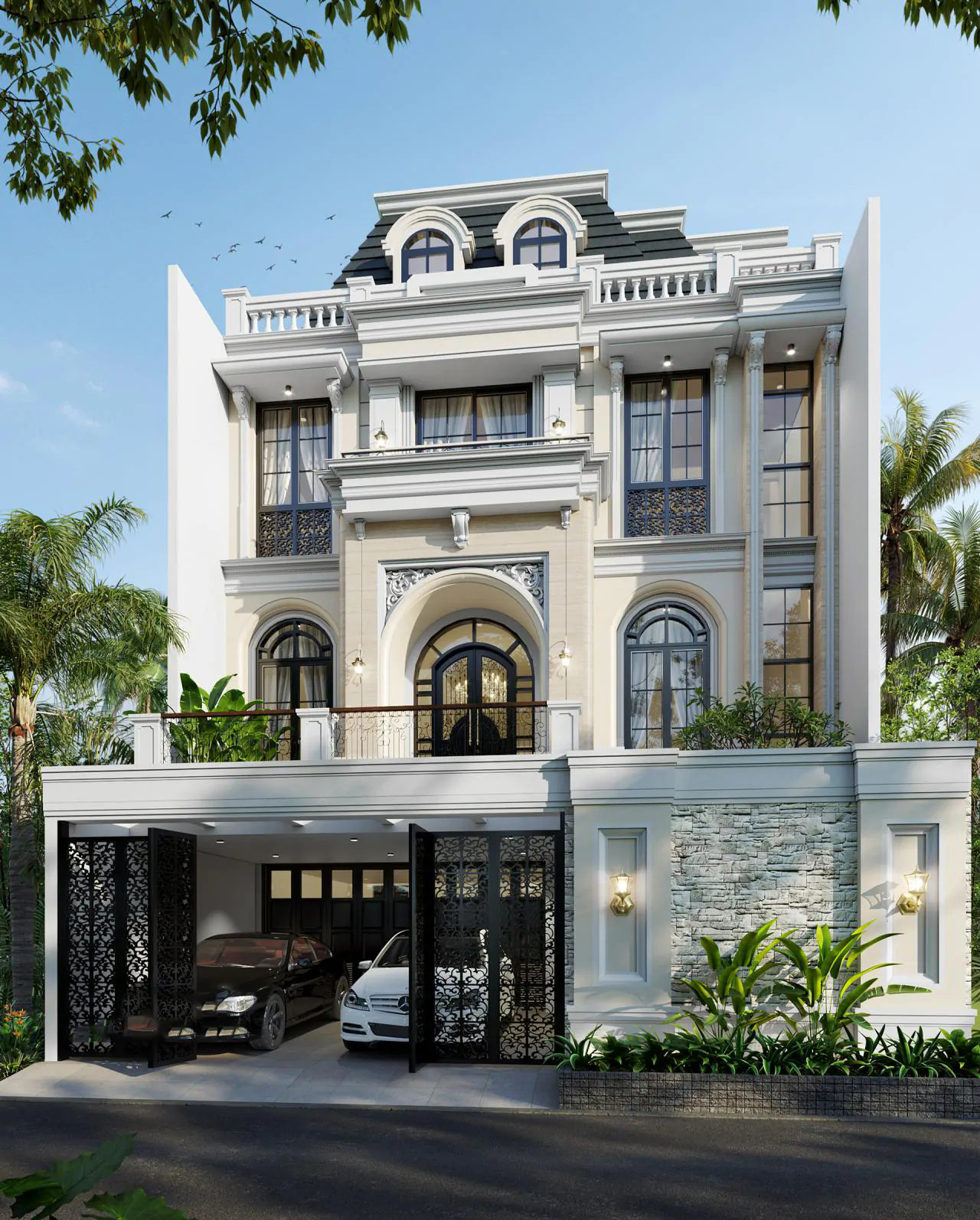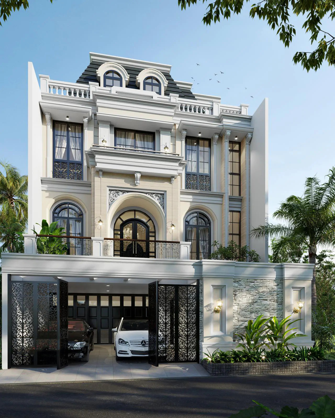Với màu trắng tinh khôi làm chủ đạo điểm xuyết bằng màu đen huyền bí, ngôi biệt thự mang đến cho người nhìn cảm giác thanh lịch nhưng không kém phần sang trọng. Ngoài ra, việc sử dụng hệ mái mansard càng làm cho mẫu nhà tân cổ điển 3 tầng thêm hút mắt và tạo được ấn tượng khó phai.