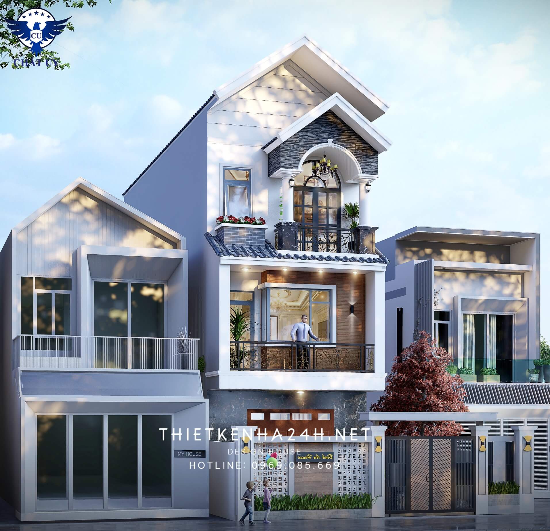 Mẫu thiết kế này lấy tông màu trắng làm chủ đạo nhưng đã thổi luồng sinh khí mới vào phong cách nhà kiểu mái thái này. Nhà phố là sự tổng hòa của vẻ đẹp sang trọng, hiện đại nhưng cũng rất gần gũi, thân quen, công trình mái thái kép, nhiều tầng khiến ngôi nhà càng thêm lộng lẫy.