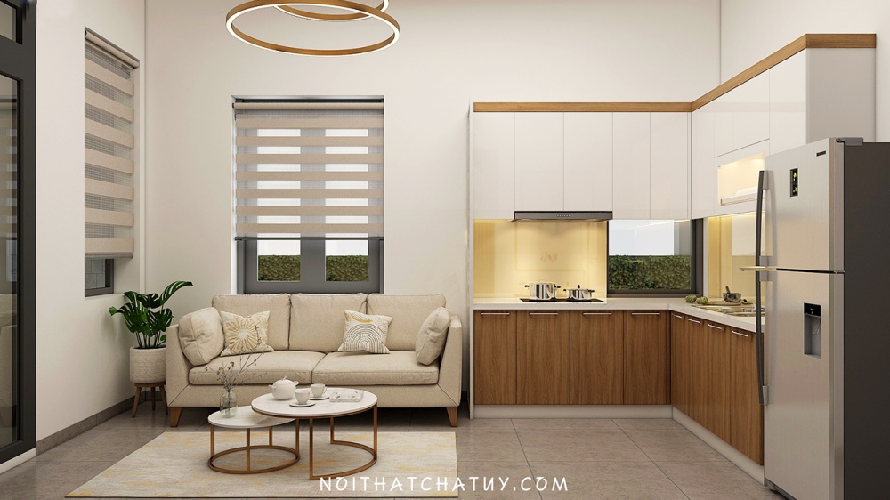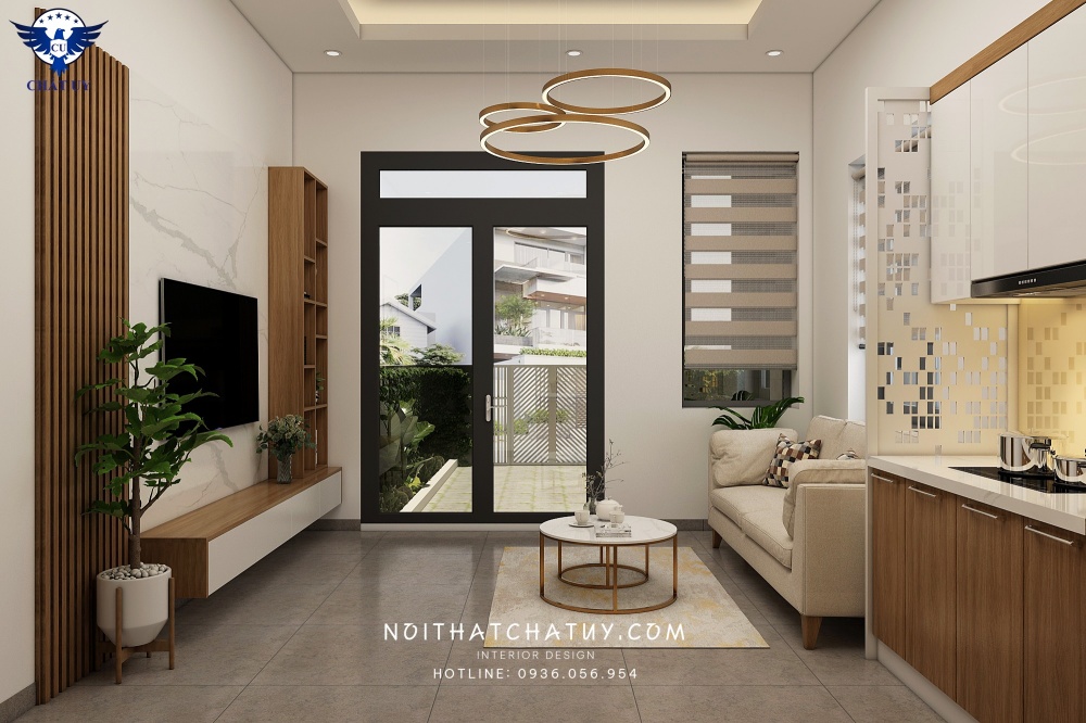 Để tận dụng diện tích, kiến trúc sư tại Chất Uy đã kết hợp thiết kế phòng khách và phòng bếp cùng một không gian. Thiết kế này không những độc đáo, gọn gàng mà còn mang lại nhiều tiện nghi khi sử dụng.