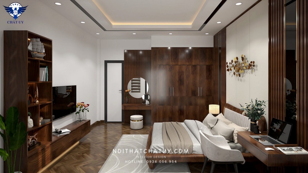 Phòng ngủ người lớn được thiết kế với diện tích lớn hơn, đầy đủ tiện nghi. Nội thất phòng ngủ được bài trí đẹp mắt, gọn gàng giúp không gian thêm thoáng đãng, dễ chịu. Tông màu nâu được sử dụng nhiều hơn như một cách để làm mát căn phòng hơn khi mùa hè đến và tạo sự ấm cúng khi động sang.