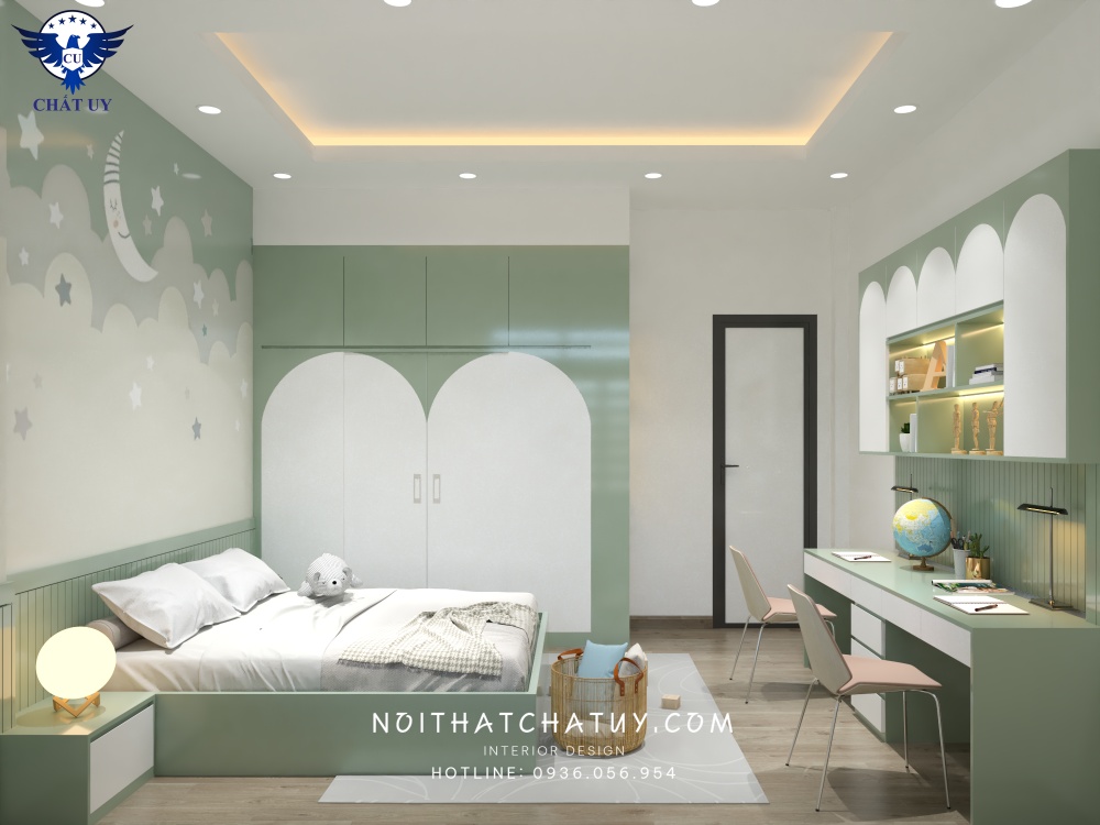 Trong khi đó, với không gian phòng ngủ cho trẻ nhỏ, tông màu xanh mint và trắng chính là sắc màu chủ đạo. Sự kết hợp hài hòa này giúp căn phòng dễ chịu, nhìn xinh xắn và dễ thương. Thay vì sử dụng sàn đồng màu với nội thất như ở phòng ngủ người lớn, ở không gian này các kiến trúc sư đã chọn tông màu nâu xám khác biệt giúp căn phòng trở nên sáng hơn và mang một năng lượng tích cực, tươi mới.
