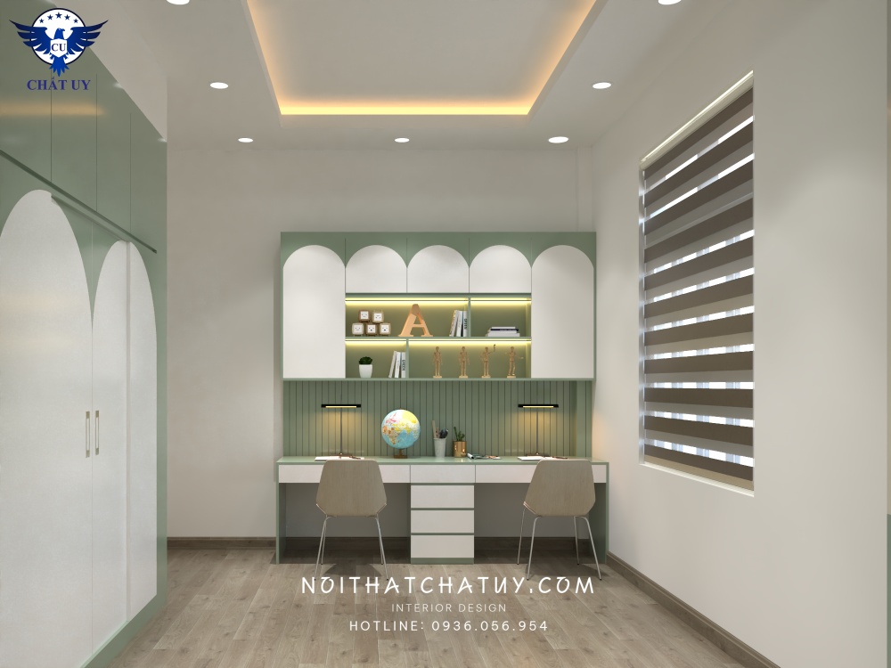 Phòng ngủ trẻ nhỏ là sự ưu tiên cho phong cách trẻ trung, nhẹ nhàng nhưng vẫn cần bảo đảm sự tinh tế và xinh xắn. Với tông màu xanh trắng trìu mến, các kiến trúc sư đã thành công tạo nên một không gian mơ màng, trong sáng và ngây thơ phù hợp với lứa tuổi học trò. Nội thất phòng cũng được sắp xếp gọn gàng để nhường chỗ cho không gian vui chơi và học tập.