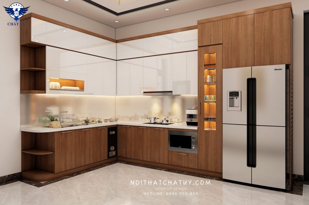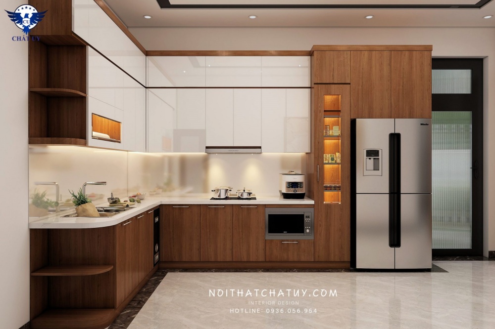 Bên cạnh đó, bếp còn được thiết kế với nhiều ngăn tủ có kích thước khác nhau, giúp gia đình có để đựng đồ với khối lượng lớn. Mọi diện tích tại đây đều được tận dụng một cách tối ưu, và không bị bỏ thừa.