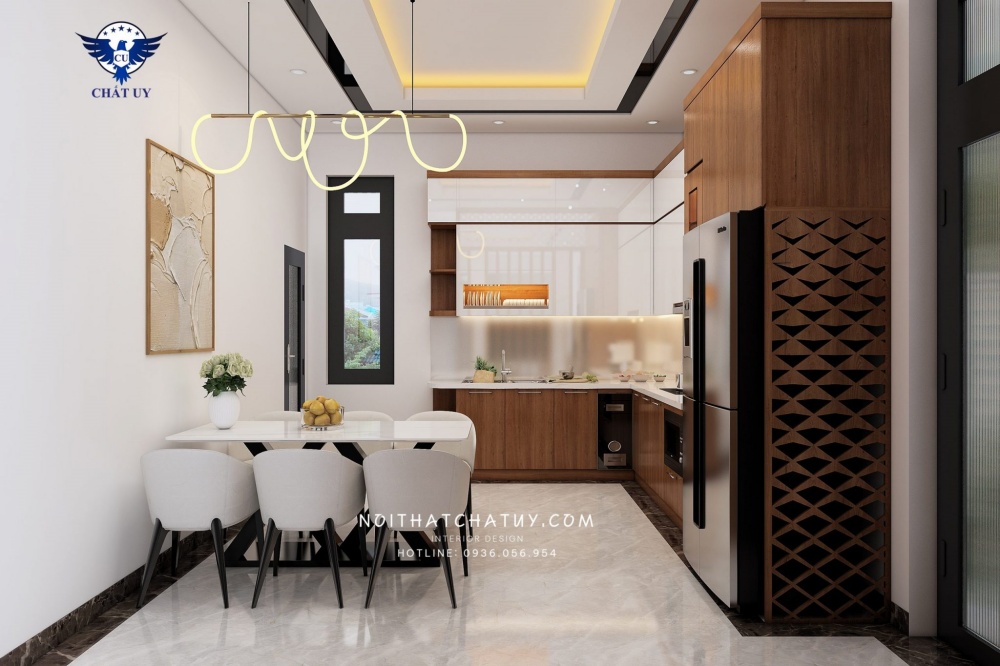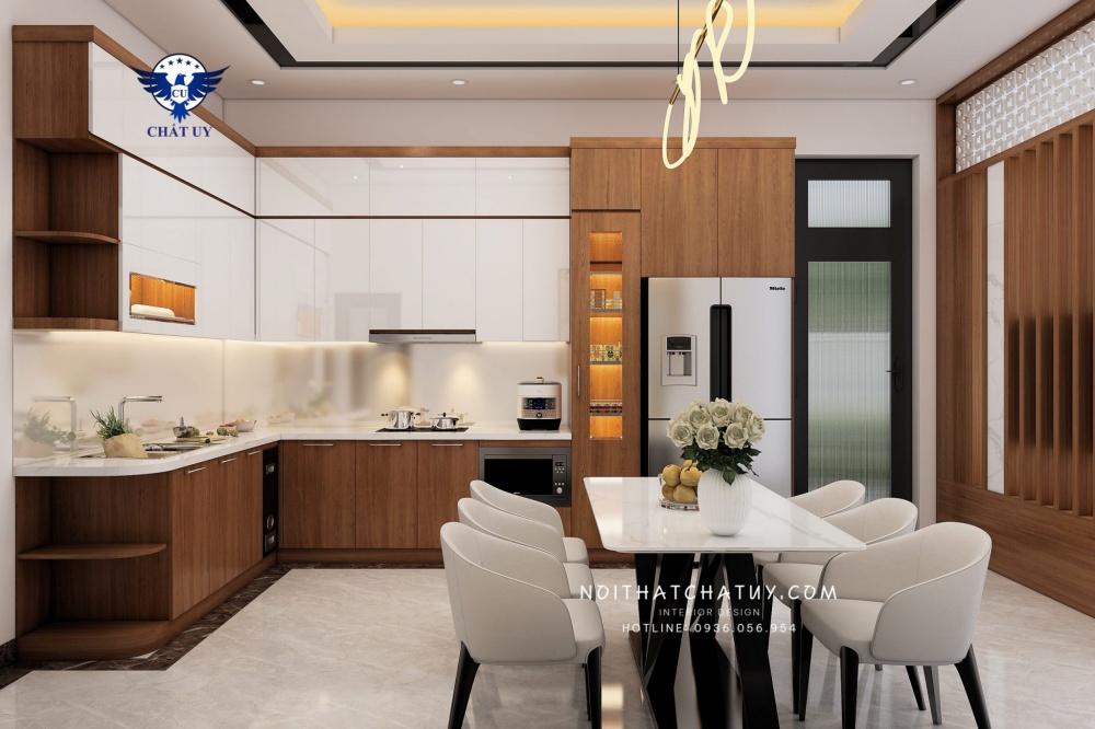 Khu vực phòng bếp được thiết kế ngay phía sau nổi bật với bộ bàn ăn gồm 6 ghế chắc chắn cùng bàn ăn dài đặt chính giữa. Khu vực bếp núc được thiết kế nội thất đầy đủ với các thiết bị như: tủ lạnh, tủ bát, hệ thống bồn rửa,… được bố trí khoa học, thuận tiện cho việc sinh hoạt và sử dụng.