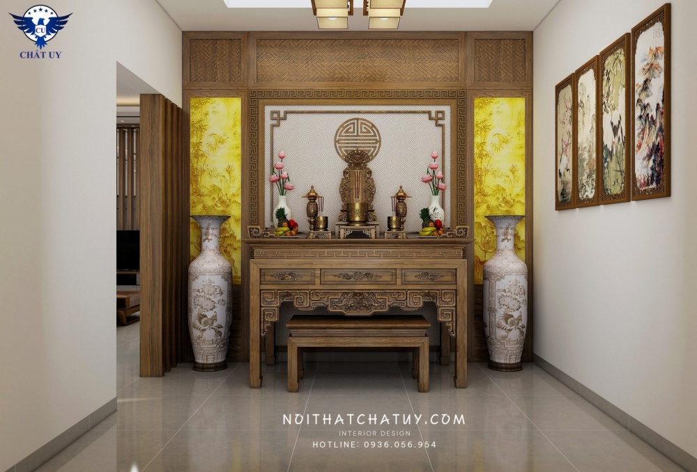 Thiết kế nội thất phòng thờ chú trọng và sự trang nghiêm và mang đậm yếu tố tâm linh với bộ bàn thờ tone màu nâu trầm được chạm trổ những đường nét rồng phượng tạo sự sang trọng, tinh tế cho toàn bộ không gian. Cùng bộ lục bình và 4 bức tranh tất cả đã tạo nên sự ấn tượng vô cùng lớn đối với không gian đặc biệt trong căn nhà.